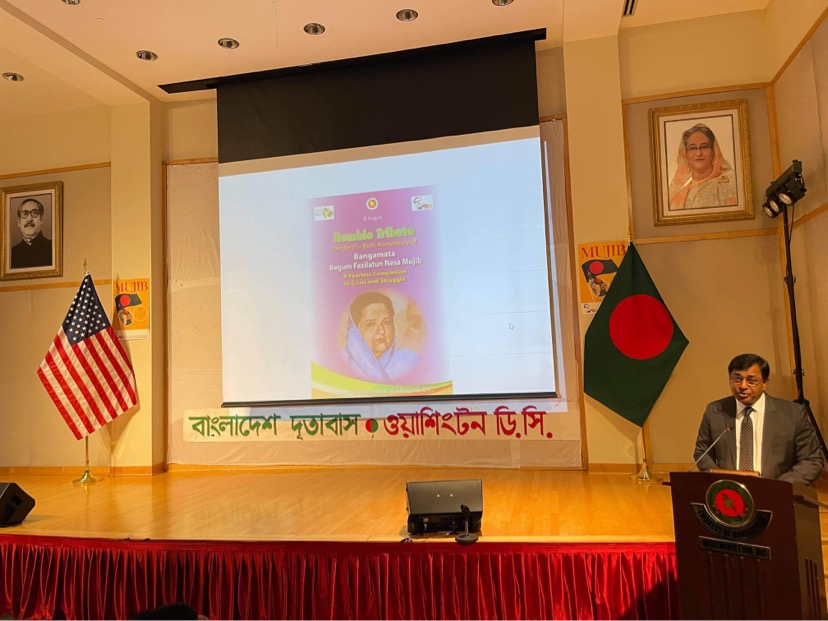 হাকিকুল ইসলাম খোকন,যুক্তরাষ্ট্র : ওয়াশিংটন ডিসিতে বাংলাদেশ দূতাবাস যথাযথ মর্যাদায় জাতির পিতা বঙ্গবন্ধু শেখমুজিবুর রহমানের সহধর্মিনী বঙ্গমাতা শেখ ফজিলাতুন নেসা মুজিবের  ৯১তম জন্মবার্ষিকী পালন করেছে।  দিবসটি উপলক্ষেপরিবার, দেশ এবং জাতির জন্য বঙ্গমাতার আত্মত্যাগ স্মরণ করে ৮ই আগস্ট ,রবিবার, দূতাবাসের বঙ্গবন্ধু মিলনায়তনে একটিঅনুষ্ঠানের আয়োজন করা হয় । অনুষ্ঠানে রাষ্ট্রপতি এবং  প্রধানমন্ত্রী কর্তৃক প্রদত্ত বাণী পাঠ করে শোনান যথাক্রমে দূতাবাসের ইকোনমিক মিনিস্টার মেহেদীহাসান এবং প্রতিরক্ষা অ্যাটাশে ব্রিগেডিয়ার জেনারেল এম ম‌ঈনুল হাসান। রাষ্ট্রদূত এম সহিদুল ইসলাম তার বক্তব্যে নিজ পরিবারের প্রতি বঙ্গমাতার অঙ্গীকার, বঙ্গবন্ধুর জীবনে তাঁর প্রভাব এবংবাংলাদেশের ইতিহাসের গতিপথ নির্ধারণে পর্দার অন্তরালে থেকেও অত্যন্ত তাৎপর্যপূর্ণ ভূমিকার কথা  তুলে ধরেন। বাংলাদেশেরমুক্তি সংগ্রামে অত্যন্ত গুরুত্বপূর্ণ ভূমিকা রাখা বঙ্গবন্ধুর কিছু সিদ্ধান্ত গ্রহণে বঙ্গমাতা যেভাবে ভূমিকা রেখেছিলেন  তা শ্রদ্ধার সাথেস্মরণ করেন। অনুষ্ঠানে বঙ্গমাতা শেখ ফজিলাতুন নেসা মুজিবের জীবন ও কর্মের ওপর একটি  প্রামাণ্যচিত্র প্রদর্শন করা হয়।  অনুষ্ঠানের শেষপর্যায়ে জাতির পিতা বঙ্গবন্ধু শেখ মুজিবুর রহমান, বঙ্গমাতা ফজিলাতুন নেছা মুজিব, তাদের পরিবারের সদস্যবৃন্দসহ ১৯৭৫সালের ১৫ আগস্টের নারকীয় হামলায় শহীদ হওয়া সকলের আত্মার মাগফিরাত কামনা করে একটি বিশেষ প্রার্থনা পরিচালিতহয়।