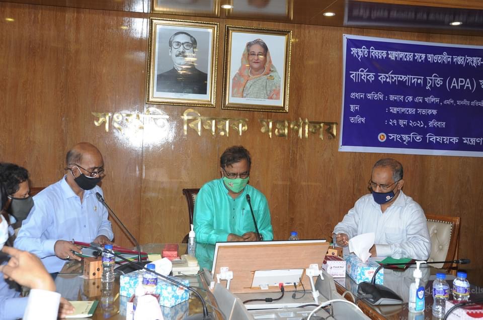 ঢাকা অফিস : সরকারের কর্মসম্পাদন ব্যবস্থাপনা পদ্ধতির আওতায় সংস্কৃতি বিষয়ক মন্ত্রণালয়ের সঙ্গে আওতাধীন অন্যান্য দপ্তর/সংস্থার ২০২১-২২ অর্থবছরের বার্ষিক কর্মসম্পাদন চুক্তি (APA) আজ দুপুরে সংস্কৃতি বিষয়ক মন্ত্রণালয়ের সভাকক্ষে স্বাক্ষরিত হয়। চুক্তি
