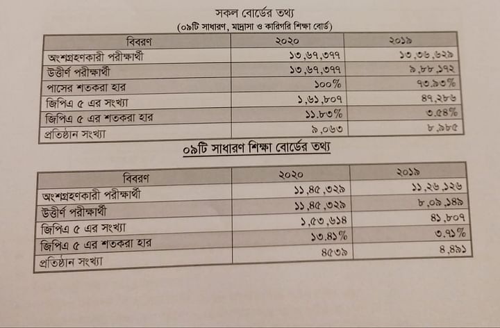 পরীক্ষা ছাড়াই এবার (২০২০ সাল) এইচএসসি ও সমমানের পরীক্ষার মূল্যায়নে পাস করেছেন সবাই। এবার মোট পরীক্ষার্থী ছিলেন ১৩ লাখ ৬৭ হাজার ৩৭৭ জন। এর মধ্য জিপিএ–৫ (গ্রেড পয়েন্ট এভারেজ) পেয়েছে