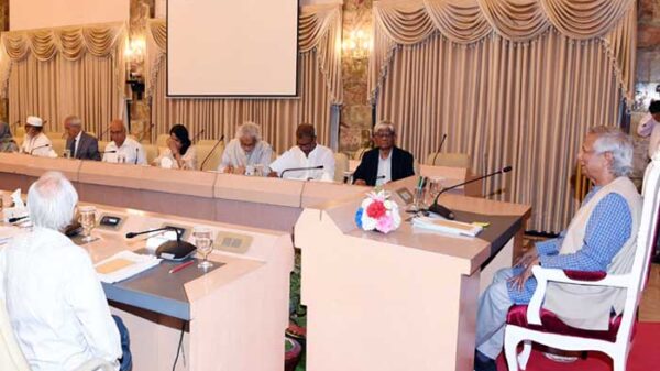 নতুন চার উপদেষ্টার শপথ নেওয়ার পর বৈঠকে বসেছে অন্তর্বর্তীকালীন সরকারের উপদেষ্টা পরিষদ। শুক্রবার (১৬ আগস্ট) বিকেলে বঙ্গভবনে প্রধান উপদেষ্টা ড. মুহাম্মদ ইউনূসের সভাপতিত্বে এ বৈঠক শুরু হয়। এর আগে বিকেল