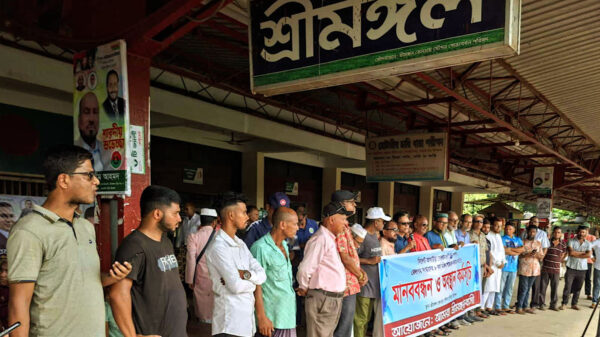 ঢাকাস্থ বৃহত্তর সিলেটবাসীর আহ্বানে ঘোষিত ৮ দফা দাবী আদায়ের পাশাপাশি যৌক্তিক বিভিন্ন দাবী আদায়ে অনুষ্ঠিত জাতীয় প্রেসক্লাবের কর্মসূচীর সাথে একাত্মতা ঘোষণা করে শ্রীমঙ্গলেও অনুষ্ঠিত হয় মানববন্ধন। শনিবার (১৮ অক্টোবর) শ্রীমঙ্গল