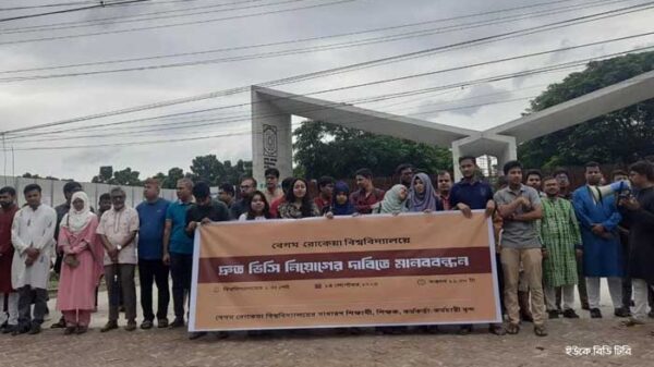 দ্রুত সময়ের মধ্যে উপাচার্য নিয়োগের দাবিতে মানববন্ধন কর্মসূচি পালন করেছে বেগম রোকেয়া বিশ্ববিদ্যালয়ে (বেরোবি) সাধারণ শিক্ষার্থীরা, শিক্ষক কর্মকর্তা-কর্মচারীরা। এ সময় তারা অন্তর্বর্তী সরকারকে ৪৮ ঘন্টার আল্টিমেটাম দেন। শনিবার (১৪ সেপ্টেম্বর)