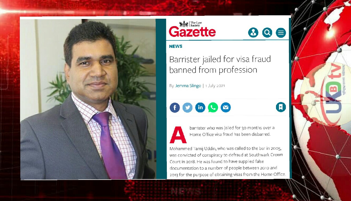 যুক্তরাজ্য অফিস: যুক্তরাজ্যে ভিসা জালিয়াতিতে সহায়তা ও কাগজপত্র তৈরির অভিযোগে মুহাম্মদ তমিজ উদ্দিন নামের ব্রিটিশ বাংলাদেশি ব্যারিষ্টারের বার লাইসেন্স বাতিল করে দেওয়া হয়েছে। ১ জুলাই ল গেজেট অনলাইন এই সংবাদ
