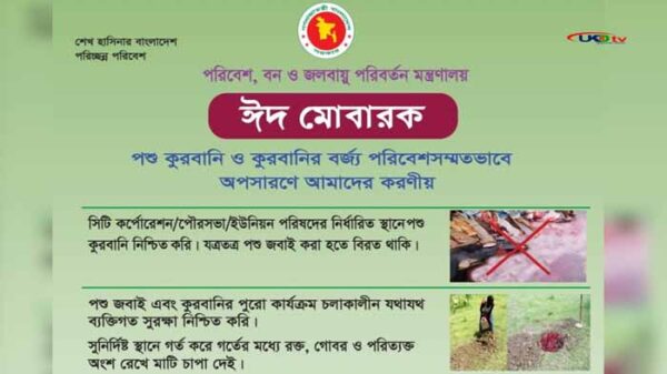 পরিবেশ ও জনস্বাস্থ্য সুরক্ষায় কোরবানির পশুর রক্ত ও বর্জ্য যথাযথভাবে পরিষ্কার এবং নির্ধারিত স্থানে ফেলার জন্য সংশ্লিষ্টদের প্রতি আহ্বান জানিয়েছে পরিবেশ, বন ও জলবায়ু পরিবর্তন মন্ত্রণালয়। এছাড়া, যত্রতত্র পশু জবাই