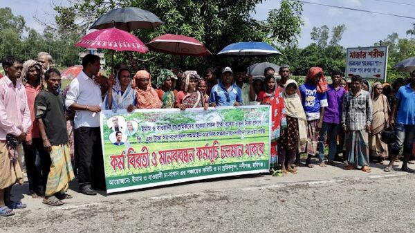 এরিয়া অর্থ-বোনাস, উৎসব ভাতা, পিএফের বকেয়া টাকা, চিকিৎসা, স্থায়ী বাসস্থান নিশ্চিত করণসহ ৭ দফা দাবীতে হবিগঞ্জের নবীগঞ্জ উপজেলায় কর্মবিরতি পালন করে মানববন্ধন করছে চা শ্রমিকরা। মঙ্গলবার (৪ জুলাই ) দুপুরে