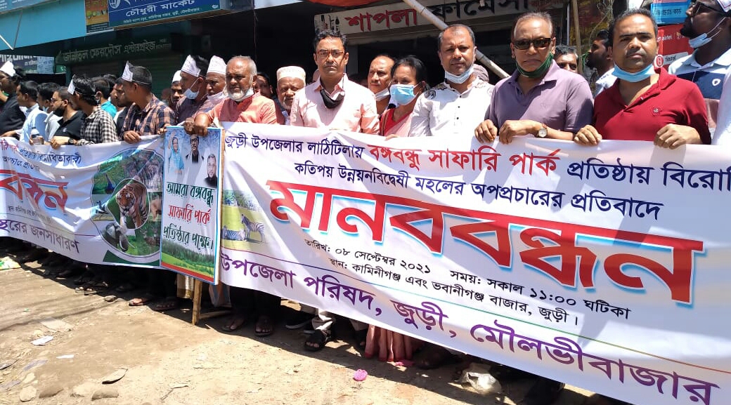 স্টাফ রিপোর্টার, জুড়ী: মৌলভীবাজারের জুড়ী উপজেলার লাঠিটিলায় বঙ্গবন্ধু সাফারি পার্ক প্রতিষ্ঠায় বিরোধিতাকারী কতিপয় উন্নয়নবিদ্বেষী মহলের অপপ্রচারের প্রতিবাদে মানববন্ধন অনুষ্টিত। বুধবার(৮ই সেপ্টেম্বর) সকালে উপজেলার সর্বস্তরের জনসাধারণের আয়োজনে কামিনীগঞ্জ বাজারে উপজেলা আওয়ামী