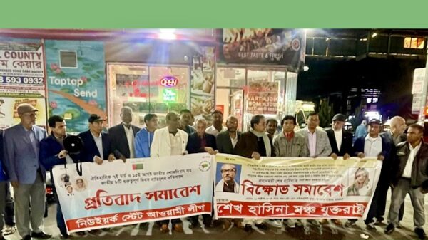 শেখ হাসিনা মন্ত্র যুক্তরাষ্ট্রের উদ্যোগে গত রবিবার.(২০ অক্টোবর) নিউইয়র্কের জ্যাকসন হাইটসে এক বিক্ষোভ সমাবেশ অনুষ্ঠিত হবয়েছে। শেখ হাসিনা মঞ্চের’ সভাপতি জালালউদ্দিন জলিলের সভাপতিত্বে ও সাধারন সম্পাদক কায়কোবাদ খাঁনের পরিচালনায় অনুষ্ঠিত