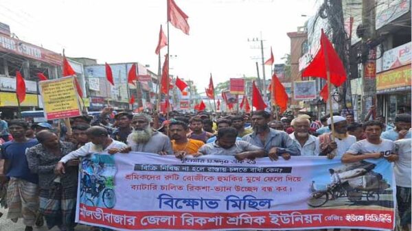 ব্যাটারি চালিত রিকশা-ভ্যান উচ্ছেদ বন্ধ, আমদানী কারক ও স-রুম গুলোর বিরুদ্ধে ব্যবস্থা এবং দ্রব্যমূল্য কমানো, বর্তমান বাজারদরের সমন্বয় করে রিকশা ভাড়া পুণঃনির্ধারণ, রিকশা ও ভ্যান শ্রমিকসহ শ্রমজীবী জনগণের জন্য স্বল্পমূল্যে