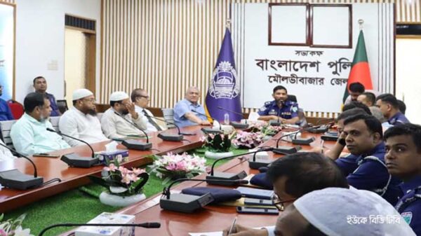 শারদীয় দুর্গাপূজা-২০২৪ উদযাপন উপলক্ষে মৌলভীবাজার জেলার বিভিন্ন রাজনৈতিক দলের নেতৃবৃন্দ এবং পূজা উদযাপন পরিষদের নেতৃবৃন্দের সাথে পুলিশ সুপার মহোদয়ের মতবিনিময় সভা অনুষ্ঠিত হয়েছে। ০৬ অক্টোবর রোববার সকাল ১১.০০ ঘটিকায় মৌলভীবাজার