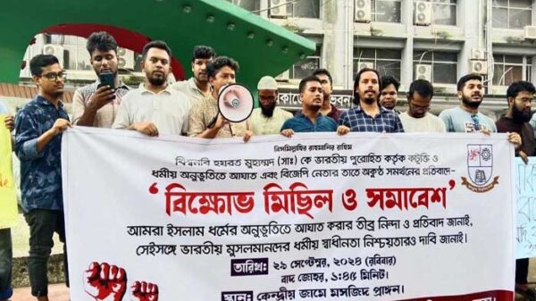 মহানবী হযরত মুহাম্মদ (সা.)-কে নিয়ে ভারতীয় পুরোহিতের কটূক্তি এবং সেই বক্তব্যকে বিজেপির এক নেতার সমর্থন দেয়ার প্রতিবাদে বিক্ষোভ মিছিল করেছেন জগন্নাথ বিশ্ববিদ্যালয়ের (জবি) শিক্ষার্থীরা। রবিবার (২৯ সেপ্টেম্বর) যোহর নামাজের পর