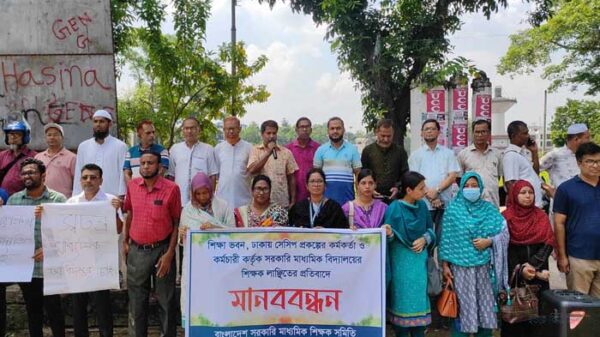 বাংলাদেশ সরকারি মাধ্যমিক শিক্ষক সমিতি মৌলভীবাজার জেলার শাখার উদ্যোগে গতকাল (বুধবার) দুপুরে শহরের চৌমহনায় মানববন্ধন হয়েছে। বাংলাদেশ মাধ্যমিক ও উচ্চ শিক্ষা অধিদপ্তরে সরকারি মাধ্যমিক শিক্ষকদের শান্তিপূর্ন কর্মসূচীতে প্রকল্প থেকে মানবিক