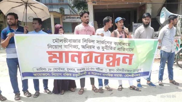 মৌলভীবাজার সিভিল সার্জন কার্যালয়ে নিয়োগ বাণিজ্য,অনিয়ম ও দূর্নীতির প্রতিবাদে মানববন্ধন কর্মসূচি পালিত হয়েছে। বুধবার দুপুরে মৌলভীবাজার প্রেসক্লাব প্রাঙ্গণে বঞ্চিত চাকুরীপ্রার্থী ও সচেতন নাগরিক সমাজের ব্যানারে এ কর্মসূচি পালন করা হয়।