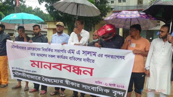 মৌলভীবাজারে বৈষম্যের শিকার সাংবাদিকরা এক দফা দাবীতে মানববন্ধন করেছে প্রেসক্লাব চত্বরে। ২১ আগষ্ট দুপুরে প্রেসক্লাব সভাপতি এমএ সালামের পদত্যাগসহ তার আমলের সকল কার্যক্রম বাতিল করও করতে হবে এই স্লোগানে বৈষম্যবিরোধী