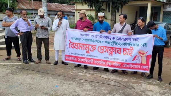 মৌলভীবাজারে প্রেসক্লাব প্রাঙ্গণে বঞ্চিত সাংবাদিকদের অন্তর্ভুক্তি ও ভোটাধিকার দাবিতে সাংবাদিকদের মানববন্ধন অনুষ্টিত হয়েছে। বৈষম্য বিরোধী সাংবাদিক ঐক্য পরিষদের সম্মনয়ক সৈয়দ মমশাদ আহমদের সভাপতিত্বে সোমবার (১৯ আগষ্ট) মৌলভীবাজার প্রেস ক্লবের সামনে