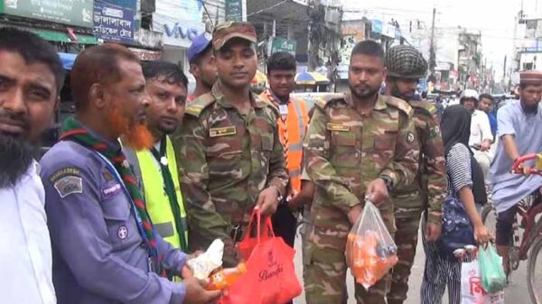 সেনাবাহিনীর পক্ষ থেকে ট্রাফিকের দায়িত্ব পালনকারী শিক্ষার্থীদের মাঝে খাবার বিতরণ