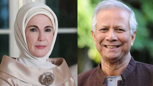 অন্তর্বর্তীকালীন সরকারের প্রধান হিসেবে দায়িত্ব নেয়া ড. মুহাম্মদ ইউনূসকে অভিনন্দন জানিয়েছেন তুরস্কের ফার্স্ট লেডি অ্যামিন এরদোগান। বৃহস্পতিবার (৮ আগস্ট) রাতে বাংলাদেশের অন্তর্বর্তীকালীন সরকারের শপথ অনুষ্ঠানের পর সামাজিক মাধ্যম এক্স হ্যান্ডেলে