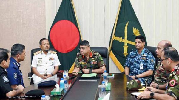 সেনাবাহিনীর প্রধান জেনারেল ওয়াকার-উজ-জামানের সঙ্গে নবনিযুক্ত পুলিশের মহাপরিদর্শক (আইজিপি) মো. ময়নুল ইসলাম, র্যাবের মহাপরিচালক এ কে এম শহিদুর রহমান ও ঢাকা মহানগর পুলিশ (ডিএমপি) কমিশনার মো. মাইনুল হাসানের বৈঠক হয়।