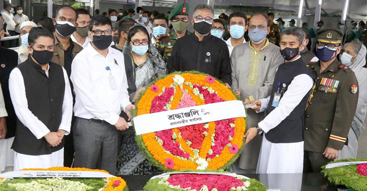 স্টাফ রিপোর্টার: ১৫ আগস্ট জাতীয় শোক দিবস ও জাতির পিতা বঙ্গবন্ধু শেখ মুজিবুর রহমানের ৪৬তম শাহাদতবার্ষিকীতে তার প্রতিকৃতিতে শ্রদ্ধা জানিয়েছে প্রধানমন্ত্রীর কার্যালয় (পিএমও)।রোববার (১৫ আগস্ট) ধানমন্ডি ৩২ নম্বরে প্রধানমন্ত্রীর মুখ্য