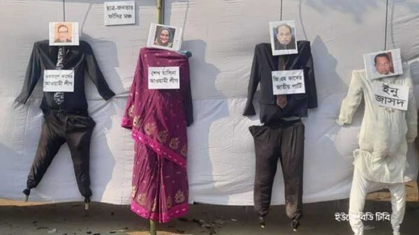 ঢাকা বিশ্ববিদ্যালয়ের (ঢাবি) টিএসসিতে শেখ হাসিনাসহ আওয়ামী লীগ, জাতীয় পার্টি ও ফ্যাসিবাদী দলের নেতাদের প্রতীকী ফাঁসি দিয়েছে বাংলাদেশ ছাত্র অধিকার পরিষদ সোমবার (৪ নভেম্বর) দুপুর ২টায় ঢাকা বিশ্ববিদ্যালয়ের টিএসসিতে এই