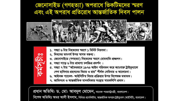 জাতিসংঘ কর্তৃক জেনোসাইড (গণহত্যা) অপরাধের ভিকটিমদের সম্মান ও মর্যাদা এবং এই অপরাধ প্রতিরোধে ঘোষিত আন্তর্জাতিক দিবস উপলক্ষে রবিবার (৭ ডিসেম্বর) সন্ধ্যা ৬ টায় নিউইয়কের জুইস সেন্টারে জেনোসাইড ’৭১ ফাউণ্ডেশন ইউএসএ