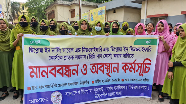 ডিপ্লোমা ইন নার্সিং সায়েন্স এন্ড মিডওয়াইফারি এবং ডিপ্লোমা ইন মিডওয়াইফারি কোর্সকে স্নাতক  সমমানের করার দাবিতে ঠাকুরগাঁওয়ে মানববন্ধন ও অবস্থান কর্মসূচি পালিত হয়েছে। বাংলাদেশ ডিপ্লোমা স্টুডেন্ট নার্সেস ইউনিয়ন ঠাকুরগাঁও জেলা শাখার
