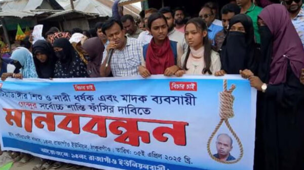 ধর্ষক শাহাজাহান আলী ওরফে গেন্দুর সর্বোচ্চ শাস্তির দাবিতে ঠাকুরগাঁও জেলার রুহিয়া থানার ১৪নং রাজারগাঁও ইউনিয়নের পাটিয়াডাঙ্গীতে এক মানব বন্ধন অনুষ্ঠিত হয়েছে। সোমবার (৫ মে)  পাটিয়াডাঙ্গী বাজারএলাকায় এই মানব বন্ধন অনুষ্ঠিত