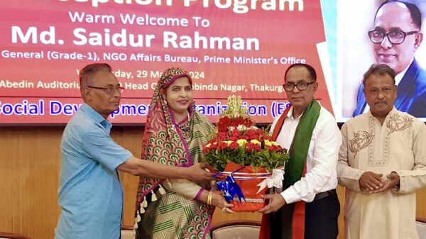 উন্নয়ন সংস্থা ইএসডিও’র পক্ষ থেকে এনজিও ব্যুরোর মহাপরিচালক (গ্রেড-১) প্রধানমন্ত্রীর কার্যালয় মো: সাইদুর রহমানকে সংবর্ধনা প্রদান করা হয়েছে। বুধবার রাতে গোবিন্দনগরস্থ সংস্থার প্রধান কার্যালয়ের জয়নাল আবেদীন মিলনায়তনে এ সংবর্ধনা অনুষ্ঠিত
