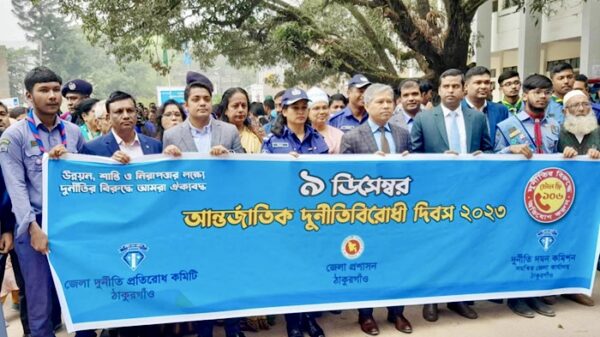 “উন্নয়ন, শান্তি ও নিরাপত্তার লক্ষ্যে দুর্নীতির বিরুদ্ধে আমরা ঐক্যবদ্ধ” এ প্রতিপাদ্যকে সামনে রেখে নানা আয়োজনের মধ্য দিয়ে ঠাকুরগাঁওয়ে আন্তর্জাতিক দুর্নীতিবিরোধী দিবস পালিত হয়েছে।জেলা প্রশাসন, জেলা দুর্নীতি প্রতিরোধ কমিটি ও