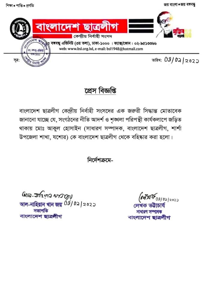 শাহারুল ইসলাম ফারদিন, যশোর: বাংলাদেশ ছাত্রলীগের শার্শা উপজেলা শাখার সাধারণ সম্পাদক আকুল হুসাইনকে সংগঠন থেকে অব্যাহতি দেওয়া হয়েছে।শনিবার বিকালে কেন্দ্রীয় ও জেলা ছাত্রলীগের প্রেস বিজ্ঞপ্তি মারফত এ সিদ্ধান্ত জানানো হয়।