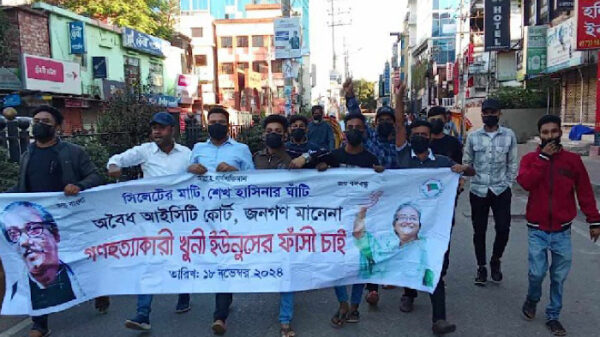 সিলেট নগরীতে ভোর বেলায় হঠাৎ জয় বাংলা, জয় বঙ্গবন্ধুর ঝটিকা মিছিল দিয়েছে একদল তরুণ। সোমবার (১৮ নভেম্বর) সকালে ১৫/২০ জনের একদল তরুণ নিষিদ্ধ ঘোষিত ছাত্রলীগের পক্ষে শ্লোগন দিয়ে থাকেন বলে