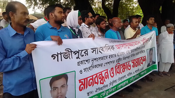 গাজীপুরের চৌরাস্তায় দৈনিক প্রতিদিনের কাগজ পত্রিকার স্টাফ রিপোর্টার সাংবাদিক আসাদুজ্জামান তুহিন কে প্রকাশ্যে হত্যার প্রতিবাদে ও হত্যা কারীদের বিচারের দাবীতে তেতুলিয়ায় সাংবাদিকদের মানববন্ধন ও প্রতিবাদ সমাবেশ অনুষ্ঠিত হয়। শনিবার বিকাল