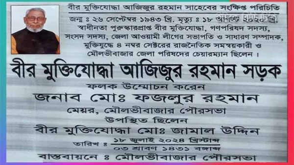 মৌলভীবাজার-শমসেরনগর-চাতলা সড়কের মৌলভীবাজার পৌরসভা অংশের নামকরণ করা হয়েছে “বীর মুক্তিযোদ্ধা আজিজুর রহমান সড়ক”। আগামী ১৮ জুলাই বৃহস্পতিবার বিকাল ৪ টার দিকে চৌমুহনায় নামফলক উন্মোচন করা হবে। পরে মৌলভী সাদী মহল