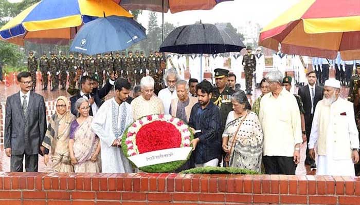 প্রথমে ড. ইউনূস সকাল ১০টার দিকে ভারী বৃষ্টির মধ্যে পুষ্পস্তবক অর্পণ করেন এবং ১৯৭১ সালের মুক্তিযুদ্ধের শহিদদের স্মৃতির প্রতি গভীর শ্রদ্ধার জানিয়ে কিছুক্ষণ নীরবে দাঁড়িয়ে থাকেন।