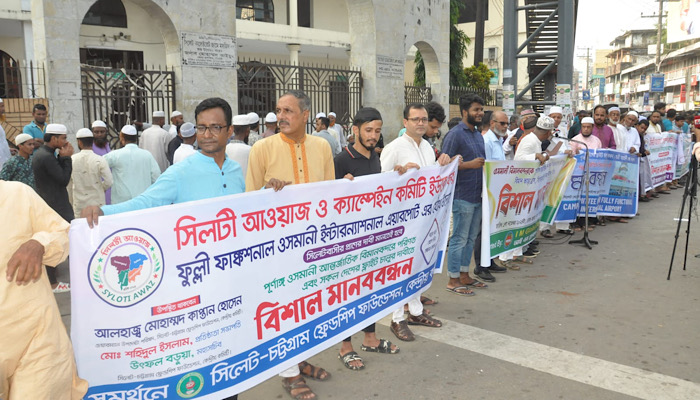 সিলটী আওয়াজ এর আহবায়ক যুদ্ধাহত বীর মুক্তিযোদ্ধা এম এ মালেক খানের সভাপতিত্বে আয়োজিত মানববন্ধনে বক্তারা অভিযোগ করে বলেন, ওসমানী আন্তর্জাতিক বিমানবন্দর শুধু নামে মাত্র আন্তর্জাতিক বিমানবন্দর। পর্যাপ্ত সুযোগ সুবিধা থাকার পরও এখানে অন্যান্য দেশের ফ্লাইট উঠা-নামার ব্যবস্থা নেয়া হচ্ছেনা। ফলে, সিলেট অঞ্চলের বিদেশ যাত্রীদের চরম হয়রানীর শিকার হতে হচ্ছে। সেই সাথে সিলেট বিদ্বেষী চক্র বাংলাদেশ বিমানে ভাড়ার ক্ষেত্রে বৈষম্য সৃষ্টি করে প্রবাসী যাত্রীদের জিম্মি করে অতিরিক্ত টাকা হাতিয়ে নিচ্ছে। এ দেশের ছাত্র-জনতা যেমনি সকল বৈষম্যের বিরুদ্ধে রুখে দাঁড়িয়েছে তেমনি সিলেটবাসীকেও ন্যায্য অধিকার আদায়ে সোচ্চার হওয়ার আহবান জানান বক্তারা। সেই সাথে সিলেটের গ্যাস বাসা-বাড়ি ও প্রতিষ্ঠানে সংযোগ প্রদান, ঢাকা-চট্টগ্রামের মতো সিলেট টু আখাউড়া নতুন ডাবল রেললাইন নির্মাণ করা এবং সিলেট টু ঢাকা মহাসড়কের ৬ লেনের কাজ দ্রুত সম্পন্ন করারও দাবি জানান বক্তারা।