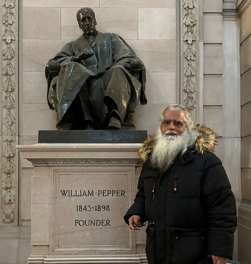 ফিলাডেলফিয়া ফ্রি লাইব্রেরির প্রতিষ্ঠাতা উইলিয়াম পেপারের ভাস্কর্যের সাথে লেখক। ছবি: লেখক