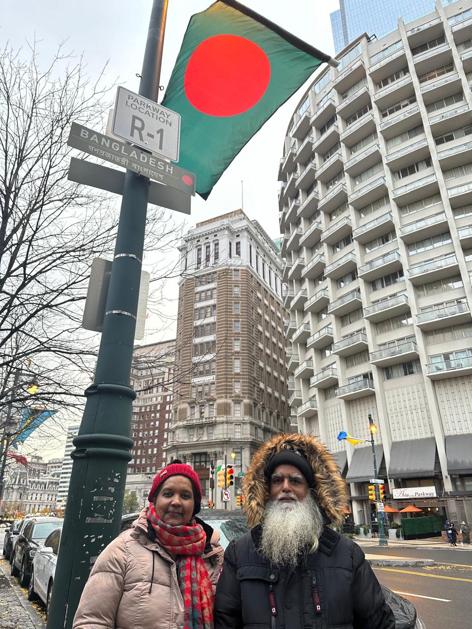 ফিলাডেলফিয়া লোগান স্কয়ারে বাংলাদেশের পতাকার নীচে লেখক ও লেখকপত্নী