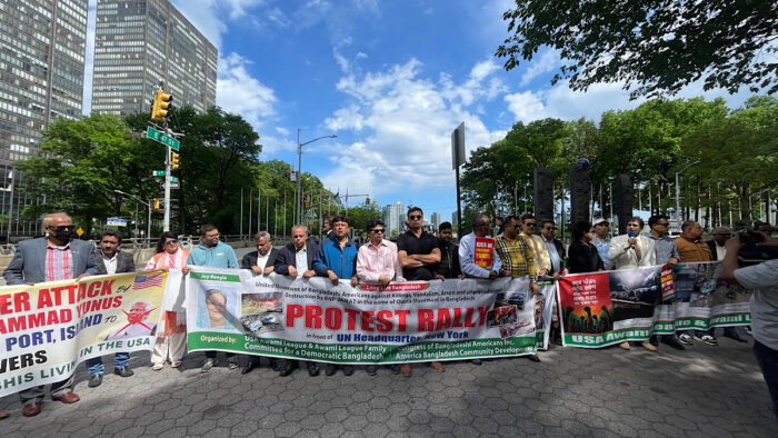 অবৈধ , অনির্বাচিত, অসাংবিধানিক ইউনূস সরকার দ্বারা অবৈধ ভাবে উপমহাদেশের প্রাচীন এবং মহান মুক্তিযুদ্ধের নেতৃত্বদানকারী, গণমানুষের দল বাংলাদেশ আওয়ামী লীগের সকল কার্যক্রম নিষিদ্ধ করা , সেন্ট মার্টিন, চট্টগ্রাম বন্দর, করিডোর দেয়ার সিদ্ধান্তের তীব্র প্রতিবাদ ও নিন্দা জানিয়ে যুক্তরাষ্ট্র আওয়ামীলীগ,আওয়ামী পরিবার, অঙ্গ সহযোগী সংগঠন সমুহসহ বিভিন্ন সামাজিক, সাংস্কৃতিক, মানবাধিকার সংগঠন এবং ডায়াসপোরার অন্যান্য সংগঠনের উদ্দোগে সোমবার (১৯ মে) নিউইয়র্কের ম্যানহাটনের জাতিসংঘ সদর দপ্তরের সামনে এক প্রতিবাদ ও বিক্ষোভ সমাবেশে অনুষ্ঠিত হয়েছে।