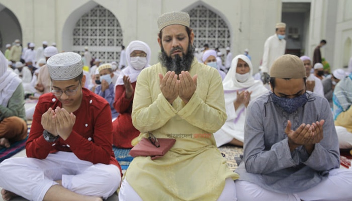 স্টাফ রিপোর্টার:মহামারী করোনার মধ্যে এক মাসের সিয়াম সাধনার পর এলো পবিত্র ঈদুল ফিতর। ধর্মীয় ভাবগাম্ভীর্যের মধ্যদিয়ে করোনা পরিস্থিতি বিবেচনায় রেখে সারাদেশে উদযাপিত হচ্ছে ঈদ। বিভিন্ন জামাতে অংশ নিয়েছেন হাজারো মুসলিম।শুক্রবার ঈদের দিন সকাল ৭টায় জাতীয় মসজিদ বায়তুল মোকাররমে প্রথম জামাত অনুষ্ঠিত হয়। এতে ইমামতি করেন বায়তুল মোকাররম জাতীয় মসজিদের সিনিয়র পেশ ইমাম হাফেজ মুফতি মাওলানা মিজানুর রহমান। মুকাব্বির ছিলেন মুয়াজ্জিন হাফেজ কারি কাজী মাসুদুর রহমান।এদিকে যথারীতি নামাজ শেষে মহামারীর থাবা থেকে বিশ্ববাসীর মুক্তি চেয়ে দেশ ও জাতির জন্য বিশেষ দোয়া করা হয়। জাতির কল্যাণ কামনা করা হয়। বালা-মুসিবত থেকে দেশকে সুরক্ষা চাওয়া হয় আল্লাহর কাছে। এ সময় ‘আমিন আমিন’ ধ্বনিতে মুখরিত হয় বায়তুল মোকাররম এলাকা।নামাজের আগে দুর-দূরান্ত থেকে মুসল্লিরা বায়তুল মোকাররম মসজিদে আসতে শুরু করেন। মসজিদের ভেতরে জায়গা না পেয়ে অনেকেই বাইরে নামাজ পড়েন।