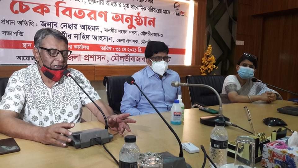 স্টাফ রিপোর্টার: মৌলভীবাজারে কর্মরত অস্বচ্ছল, অসুস্থ, দুর্ঘটনায় আহত সাংবাদিক ও মৃত সাংবাদিকদের পরিবারের মাঝে বাংলাদেশ সাংবাদিক কল্যাণ ট্রাস্ট থেকে বরাদ্দকৃত চেক প্রদান করা হয়েছে।সোমবার (৩১ মে) দুপুরে মৌলভীবাজার জেলা প্রশাসনের সম্মেলন কক্ষে প্রধান অতিথি মৌলভীবাজার-৩ আসনের সংসদ সদস্য নেছার আহমদ চেক হস্তান্তর করেন।এসময় দুর্ঘটনায় আহত একজন সাংবাদিক ও মৃত এক সাংবাদিকের পরিবার পায় বরাদ্দকৃত চেক।জেলা প্রশাসনের আয়োজনে চেক হস্তান্তর অনুষ্ঠানে সভাপতিত্ব করেন মৌলভীবাজার জেলা প্রশাসক মীর নাহিদ আহসান। অতিরিক্ত জেলা প্রশাসক (সার্বিক) তানিয়া সুলতানার সঞ্চালনায় বক্তব্য রাখেন মৌলভীবাজার প্রেসক্লাব সাধারণ সম্পাদক পান্না দত্ত, চেক গ্রহনকারী সাংবাদিক সঞ্জয় কুমার দে। এ সময় জেলা প্রশাসনের কর্মকর্তাবৃন্দ, শ্রীমঙ্গল উপজেলা প্রেসক্লাবের সাধারণ সম্পাদক বিকুল চক্রবর্তীসহ গনমাধ্যমকর্মিরা উপস্থিত ছিলেন। দৈনিক খোলা চিঠি পত্রিকার সহ সম্পাদক প্রয়াত সাংবাদিক কে পি দাশ বুলুর সহধর্মিণী ঝর্ণা দাশের হাতে তিন লক্ষ টাকার চেক এবং মাইটিভি জেলা প্রতিনিধি আহত সাংবাদিক সঞ্জয় কুমার দের হাতে পঞ্চাশ হাজার টাকার চেক তুলে দেন সংসদ সদস্য নেছার আহমদ ও জেলা প্রশাসক মীর নাহিদ আহসান। প্রয়াত সাংবাদিক কে পি দাশ বুলুর পরিবার মরণোত্তর আর্থিক সহায়তার আবেদন করলে সাংবাদিক কল্যান ট্রাস্ট এই চেক বরাদ্ধ দেয়। গত ১৫ জুলাই ২০১৭ সালে ক্যান্সারে আক্রান্ত হয়ে মারা যান সাংবাদিক কে পি দাশ। আর সাংবাদিক সঞ্জয় কুমার দে পেশাগত দায়িত্ব পালন কালে দুর্ঘটনায় আহত হয়েছিলেন। আহত সাংবাদিক ও সাংবাদিক পরিবারকে আর্থিক সহায়তা দেয়ায় প্রধানমন্ত্রী শেখ হাসিনা, বাংলাদেশ সাংবাদিক কল্যাণ ট্রাস্টের ব্যবস্থাপনা পরিচালক জাফর ওয়াজেদ সহ সংশ্লিষ্ট সকলকে ধন্যবাদ ও কৃতজ্ঞতা প্রকাশ করেন বক্তারা।