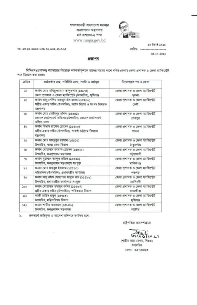 নরসিংদীর ডিসি সৈয়দা ফারহানা কাউনাইনকে সড়ক পরিবহন ও মহাসড়ক বিভাগের উপসচিব, পাবনার ডিসি কবির মাহমুদকে ভূমি মন্ত্রণালয়ের উপসচিব, পঞ্চগড়ের ডিসি সাবিনা ইয়াসমিনকে খাদ্য মন্ত্রণালয়ের উপসচিব এবং সাতক্ষীরা ডিসি এস এম মোস্তফা কামালকে মাধ্যমিক ও উচ্চ শিক্ষা বিভাগের উপসচিব নিয়োগ দেওয়া হয়েছে।