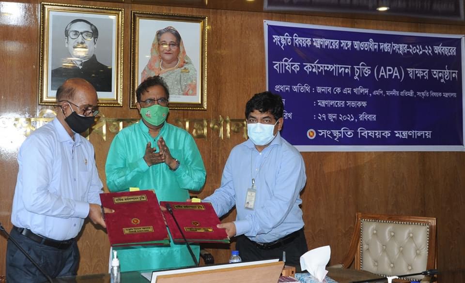 ঢাকা অফিস : সরকারের কর্মসম্পাদন ব্যবস্থাপনা পদ্ধতির আওতায় সংস্কৃতি বিষয়ক মন্ত্রণালয়ের সঙ্গে আওতাধীন অন্যান্য দপ্তর/সংস্থার ২০২১-২২ অর্থবছরের বার্ষিক কর্মসম্পাদন চুক্তি (APA) আজ দুপুরে সংস্কৃতি বিষয়ক মন্ত্রণালয়ের সভাকক্ষে স্বাক্ষরিত হয়।