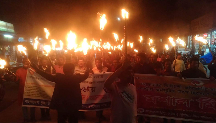 পুজো উদযাপন পরিষদের সাধারণ সম্পাদক  সাধন বসাক জানান, আওয়ামী লীগের নির্বাচনী ইশতেহারে ঘোষিত সাত দফা বাস্তবায়নের দাবিতে আজ দেশজুড়ে মশাল মিছিলের