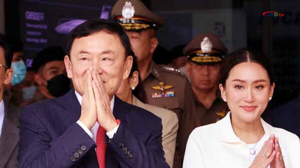 সংযুক্ত আরব আমিরাতের (ইউএই) দুবাই থেকে একটি প্রাইভেট জেটে স্থানীয় সময় সকাল ৯টায় রাজধানী ব্যাংককে অবতরণ করেন থাকসিন সিনাওয়াত্রা। এসময় তার শত শত উচ্ছ্বসিত সমর্থক উল্লাস, বক্তৃতা এবং গান করছিলেন।