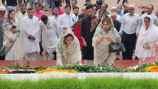 প্রধানমন্ত্রীর পক্ষে আওয়ামী লীগের সাধারণ সম্পাদক ওবায়দুল কাদের ফুল দিয়ে শ্রদ্ধা নিবেদন করেন।