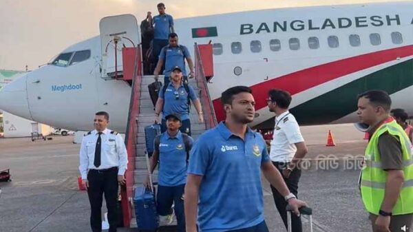 বুধবার রাত ৯টা ১৯ মিনিটে বিসিবির ভেরিফাইড পেইজে একটি ভিডিও পোস্টে দেখা যায়, ভারতের গোয়াহাটির লোকপ্রিয়া গোপীনাথ বর্দোলোই আন্তর্জাতিক বিমানবন্দরে বিমান থেকে নামছেন সাকিবরা।