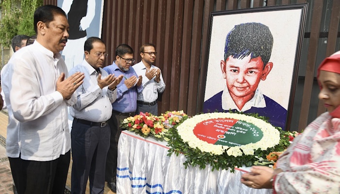 বুধবার ঢাকার বেইলি রোডে শেখ হাসিনা পার্বত্য চট্টগ্রাম ঐতিহ্য সংরক্ষণ ও গবেষণা কেন্দ্র প্রাঙ্গণে শেখ রাসেল দিবস-২০২৩ উদযাপিত হয়েছে। পার্বত্য চট্টগ্রাম বিষয়ক মন্ত্রণালয়ের পক্ষ থেকে যথাযোগ্য মর্যাদায় শেখ রাসেল স্মৃতি প্রতিকৃতিতে পুষ্পস্তবক অর্পণ করেন পার্বত্য চট্টগ্রাম বিষয়ক মন্ত্রী বীর বাহাদুর উশৈসিং এমপি ও পার্বত্য সচিব মোঃ মশিউর রহমান এনডিসি। এসময় মন্ত্রণালয়ের কর্মকর্তা কর্মচারীরা উপস্থিত ছিলেন।
