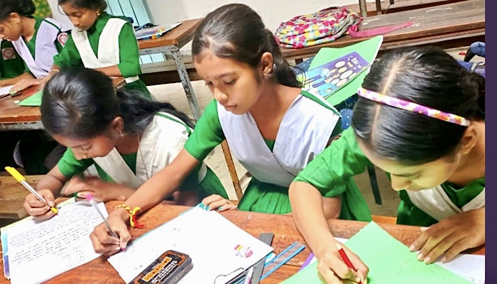 ছবিতে- সহপাঠীদের সাথে ক্লাসে মনোযোগী বাক-শ্রবণ প্রতিবন্ধী পূজা(ডান থেকে ২য়)