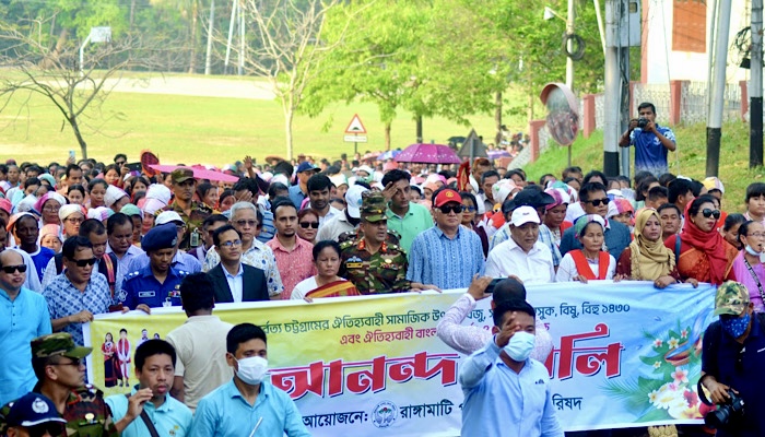 বুধবার (৩ এপ্রিল) বিকেলে বৈসাবি উপলক্ষে রাঙ্গামাটি পার্বত্য জেলা পরিষদের উদ্যোগে বর্ণিল সাজে বের করা হয় শোভাযাত্রা। শোভাযাত্রায় বিভিন্ন ক্ষুদ্র নৃ-গোষ্ঠীর তরুণ-তরুণীরা নিজ নিজ জনগোষ্ঠীর ঐতিহ্যবাহী পোষাক পরে অংশগ্রহণ করেন। শোভাযাত্রাটি রাঙামাটি সরকারি কলেজ প্রাঙ্গণ থেকে শুরু হয়ে শহরের প্রধান সড়ক প্রদক্ষিণ করে ক্ষুদ্র নৃ-গোষ্ঠী সাংস্কৃতিক ইনস্টিটিউট মিলনায়তনে গিয়ে শেষ হয়।